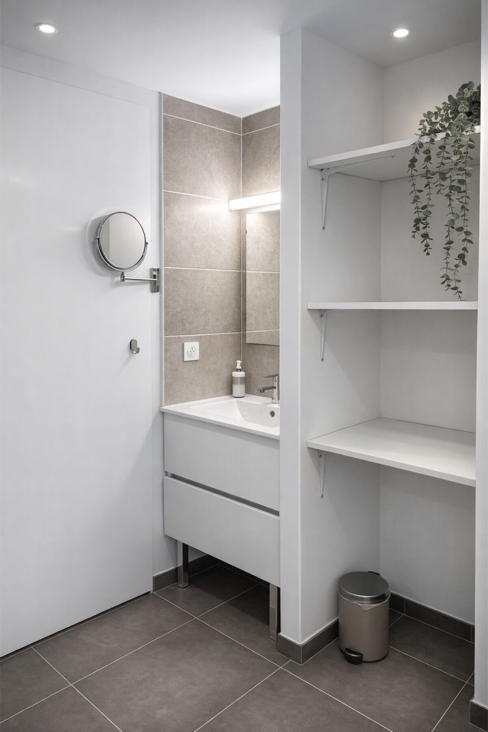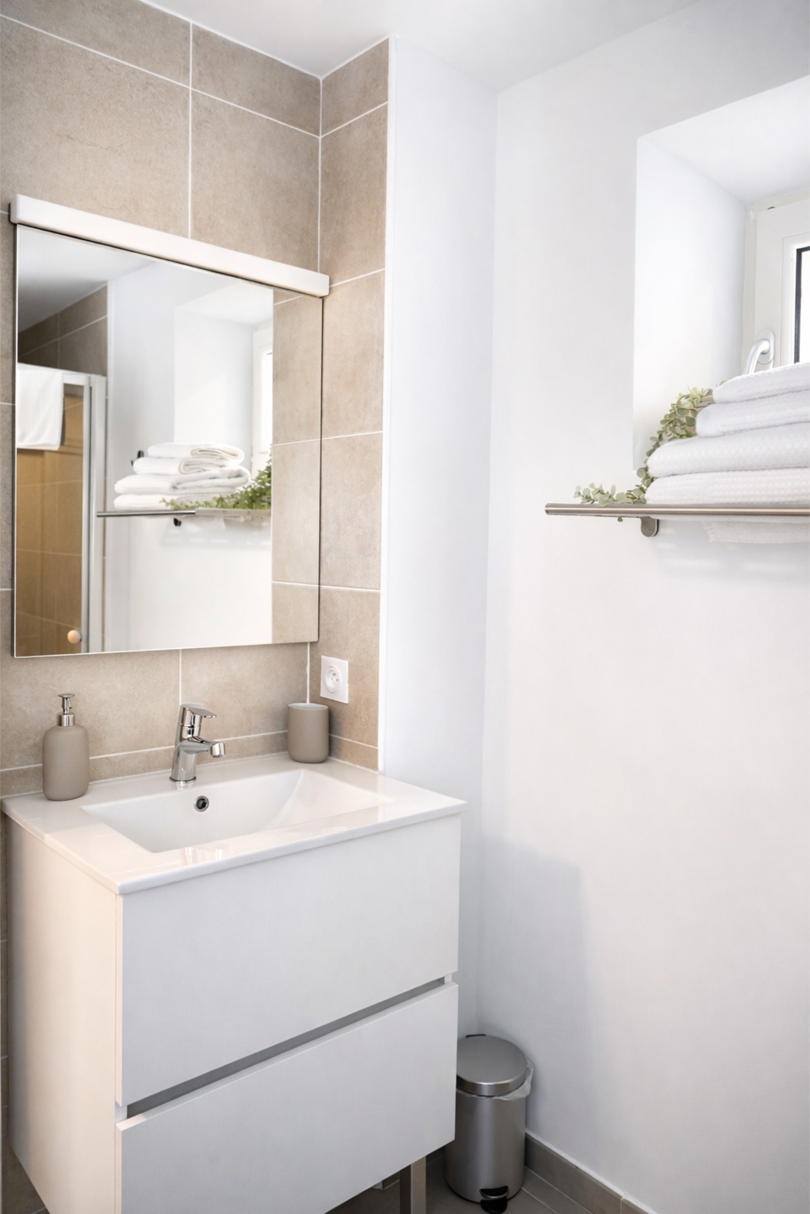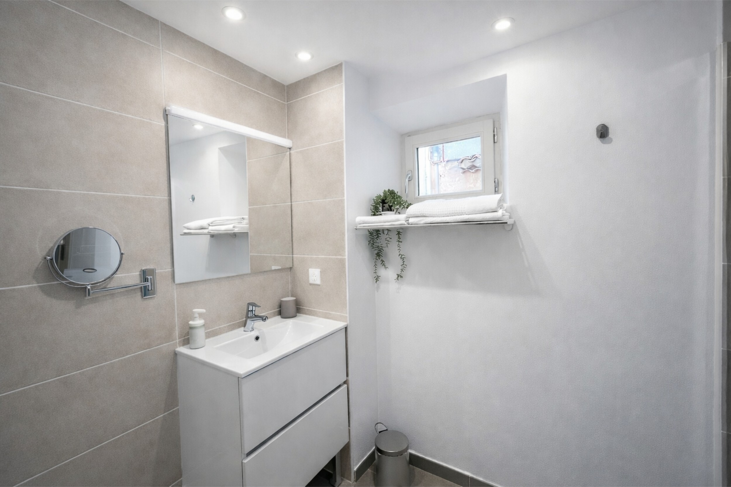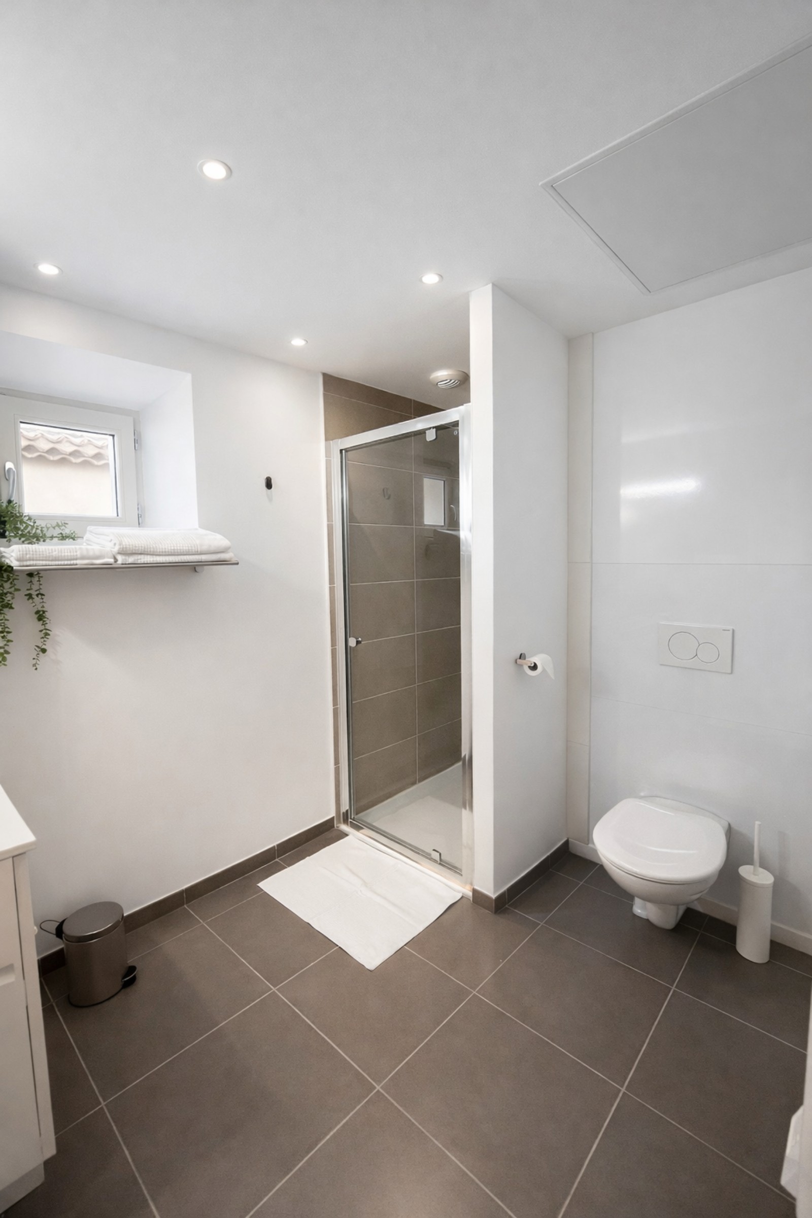 Privée avec douche, WC, lavabo, sèche cheveux, miroir grossissant, chauffage.
