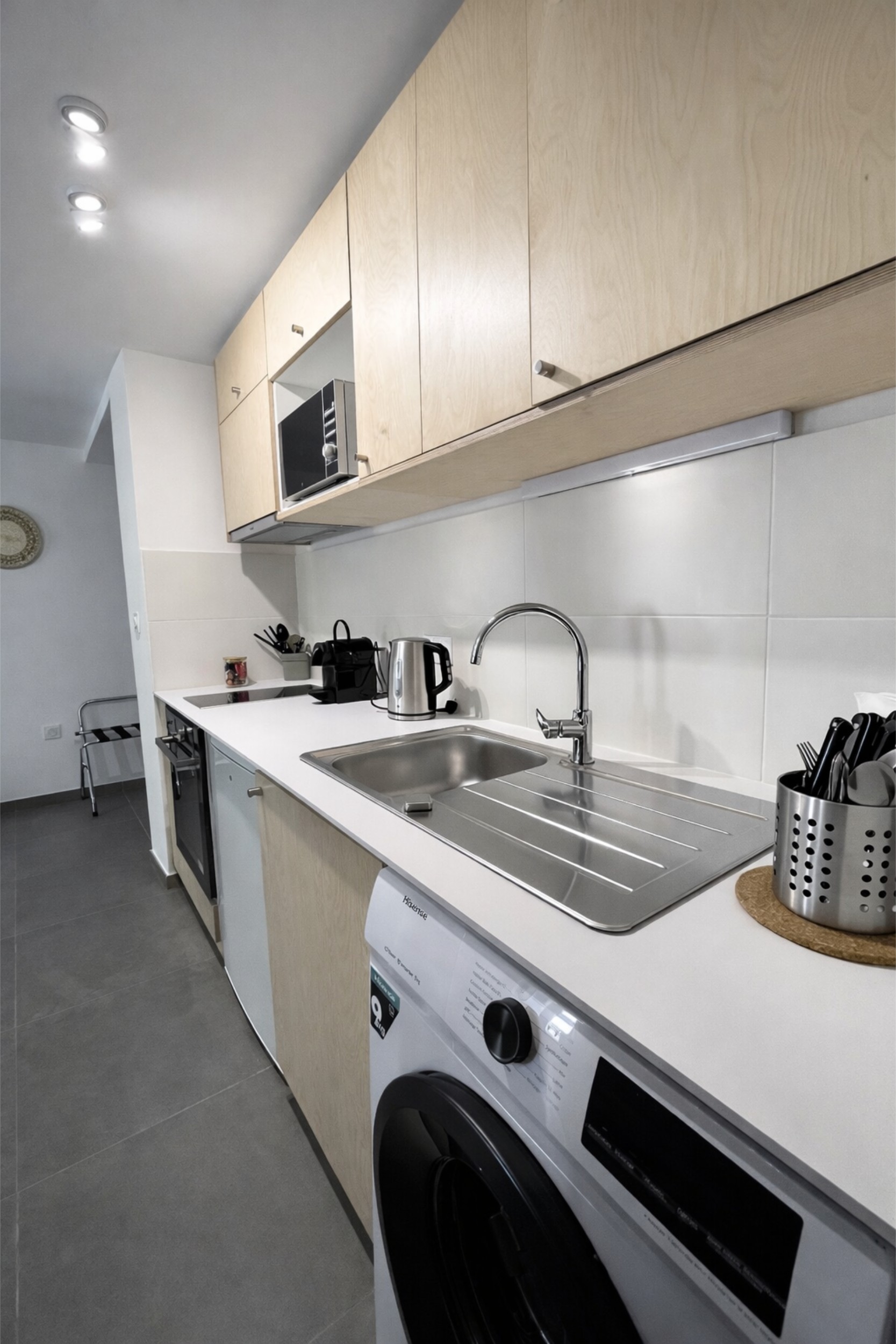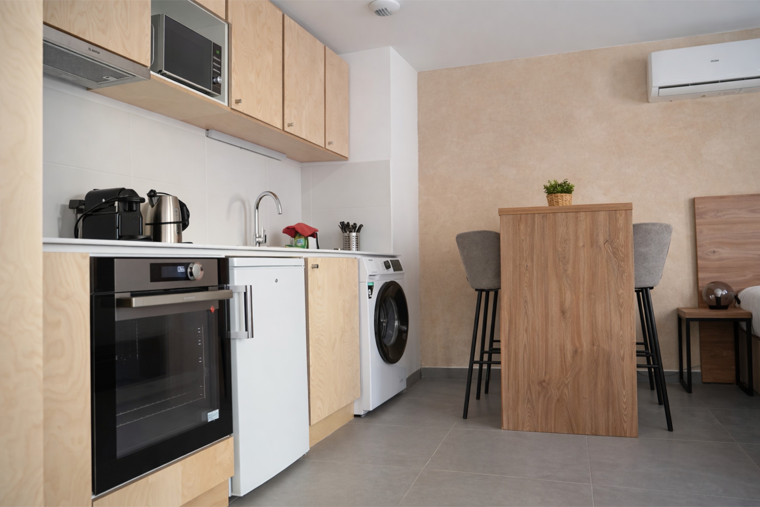 Avec plaques, hotte, four, micro ondes, bouilloire, kit vaisselle